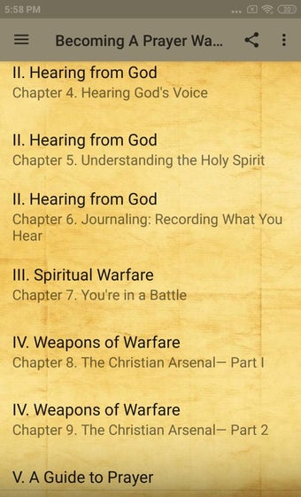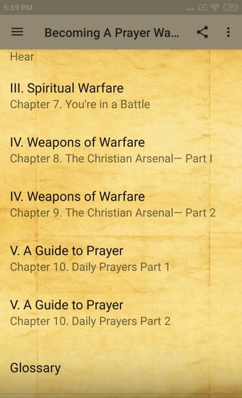 このアプリは、導入から祈りの目的、神からの啓示、霊的な戦い、戦闘の武器といった5つのセクションに分かれています。各セクションは、祈りのさまざまな側面をカバーする章にさらに分かれています。アプリには、用語集、祈りのリソース、おすすめの読み物も含まれています。全体的に、祈りの戦士になることは、神と真にコミュニケーションを取り、彼の力と喜びを前例のない形で体験するのに役立つ優れたアプリです。